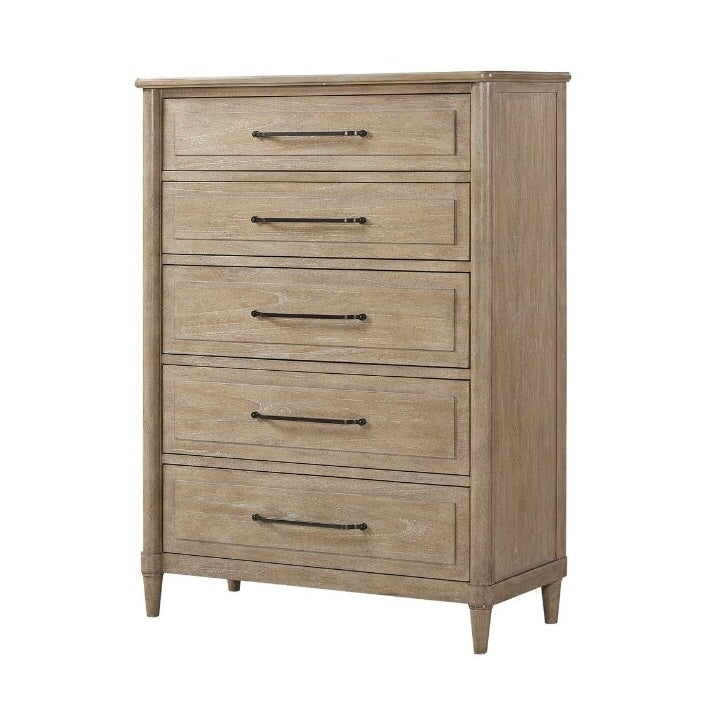 Introduce sophistication to your bedroom with the Citrus Heights Drawer Chest, crafted with precision from mindi veneer in a soothing sand color finish. This chest features five spacious drawers, providing ample storage for essentials from clothing to accessories, ensuring a clutter-free environment.
