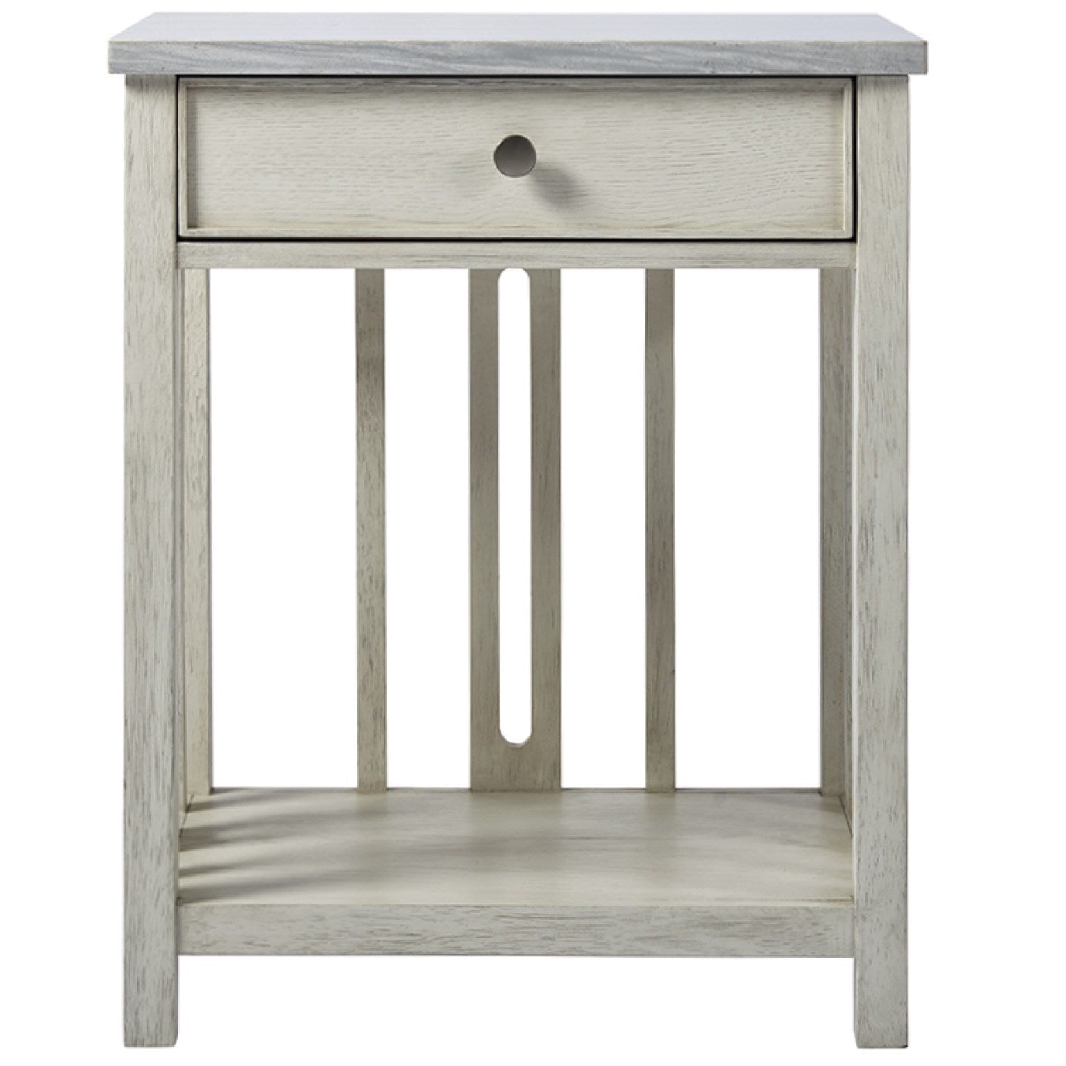Artfully combining textures and tones, the Escape Bedside Table with Stone Top features one storage drawer, an open-air display shelf, and relaxed linear detailing.