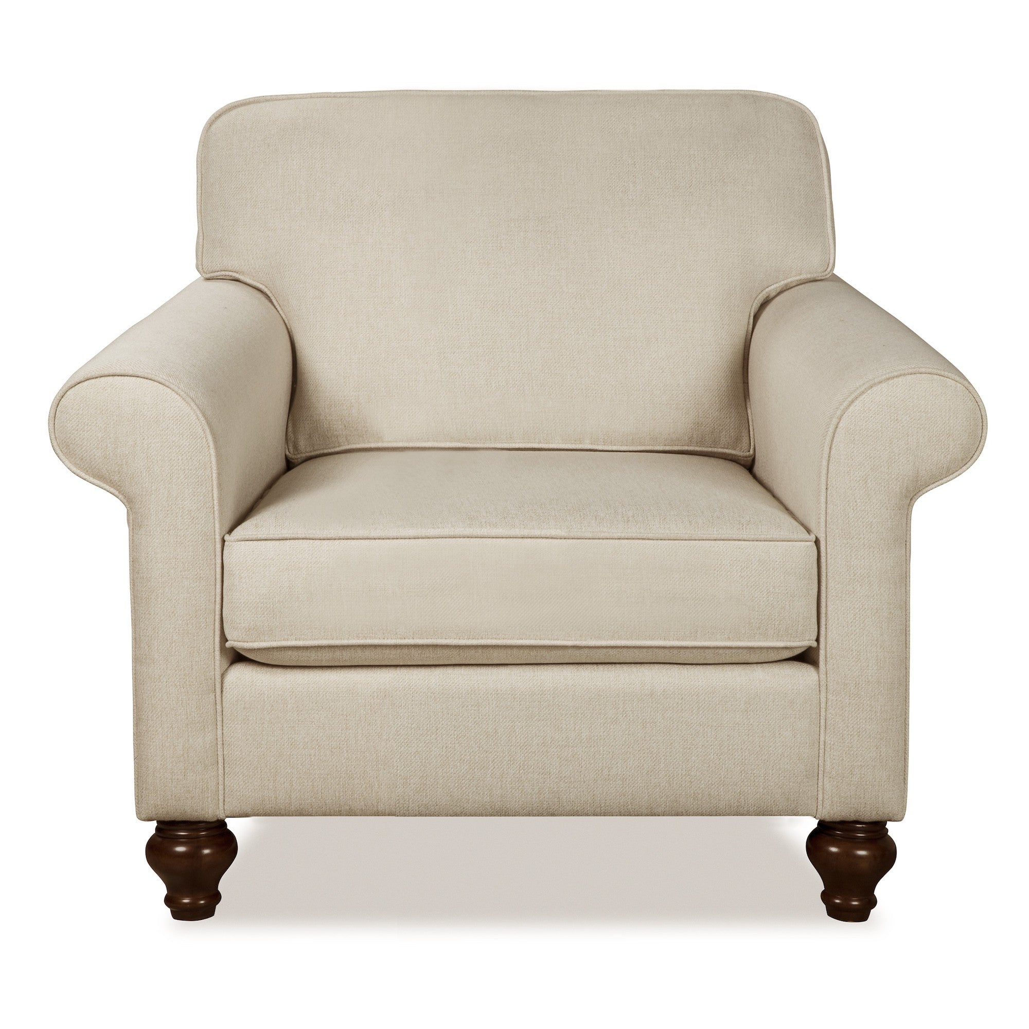 Familiar and comfortable, this classic chair features rolled sock arms and simple turned legs.