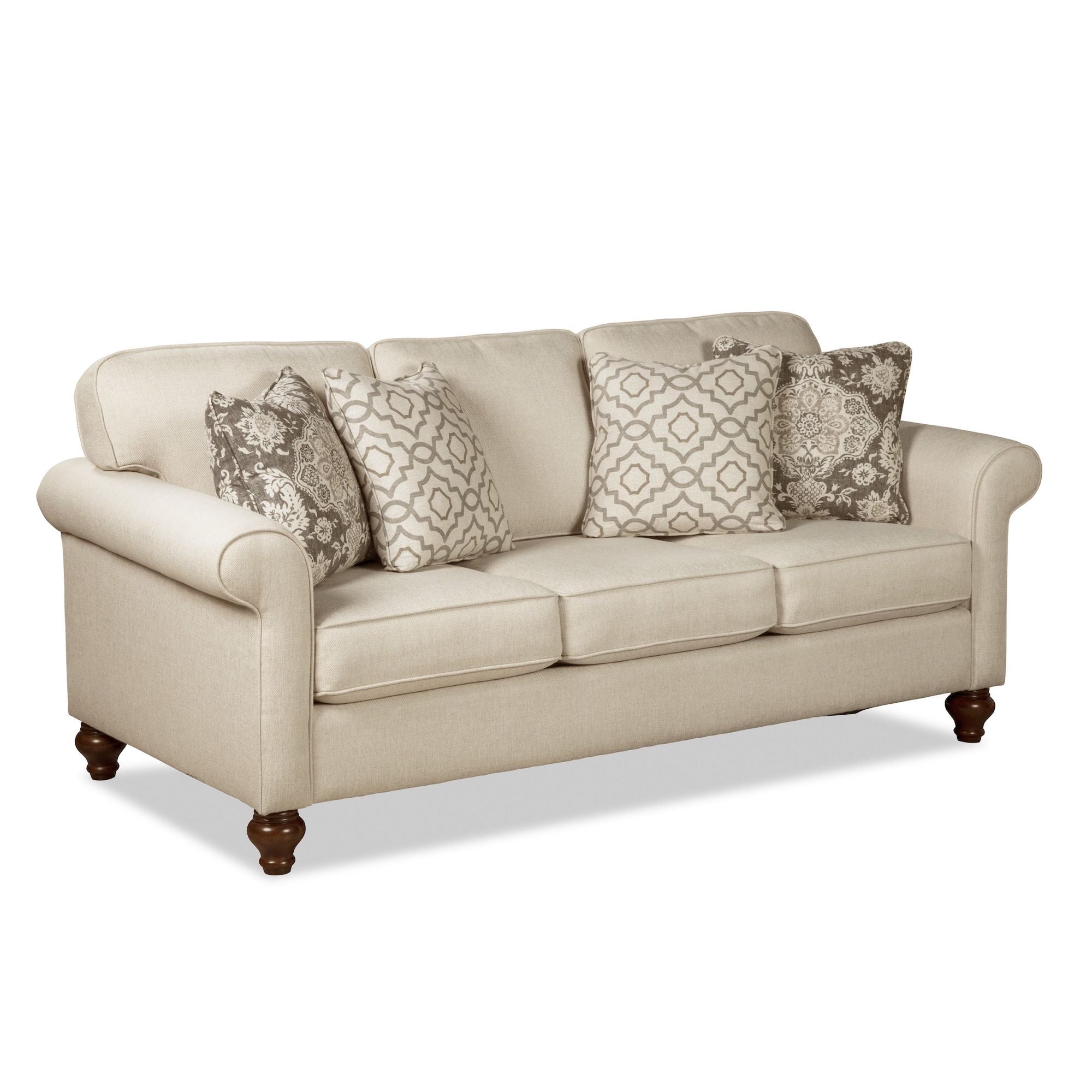 Familiar and comfortable, this classic sofa style features rolled sock arms, semi-attached back pillows, and simple turned legs.