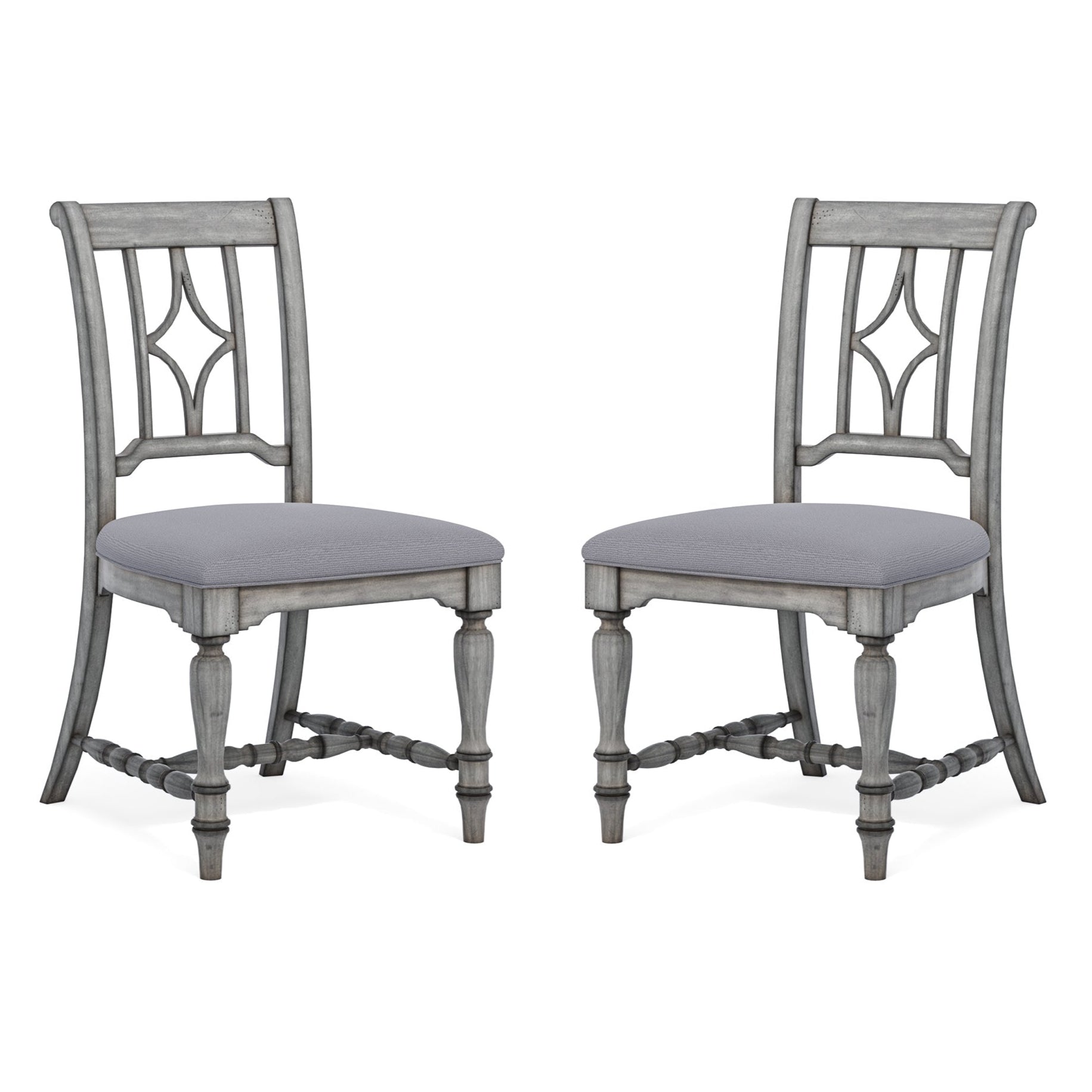 Designed to complement our Plymouth dining tables with a coordinating cottage look, this charming dining chair features an appealing open back design with a diamond-shaped detail, intricately carved trestles and turned legs for added vintage character. Available in a weathered graywash finish, each chair is upholstered in a durable and cleanable coordinating fabric, providing comfort for long periods of sitting.