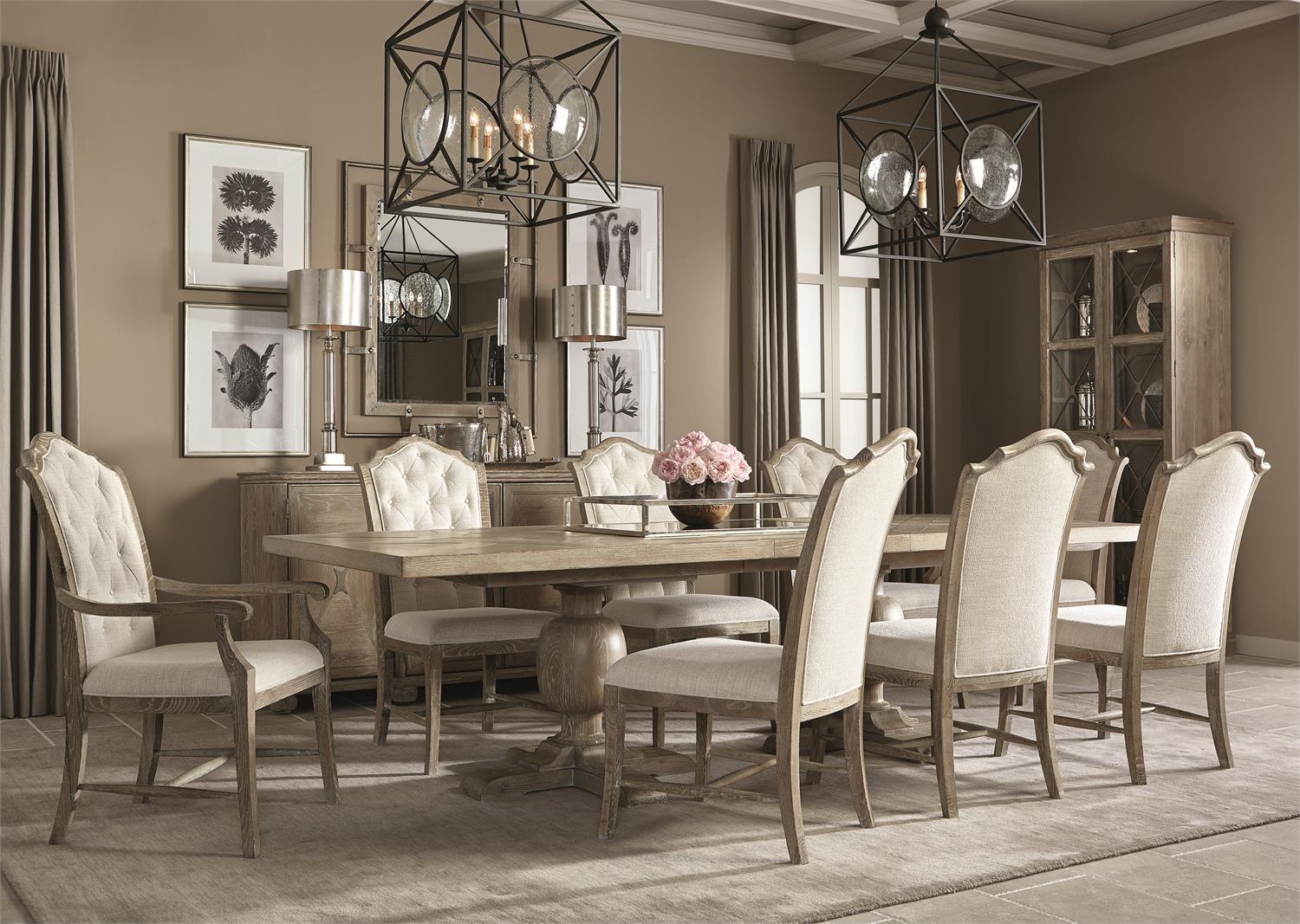 Rustic Patina offers traditional design with memorable touches of artistry and a relaxed sense of style. Influenced by English and French designs, this rectangular dining table features two urn-shaped pedestal columns, each with a four-prong wood base.