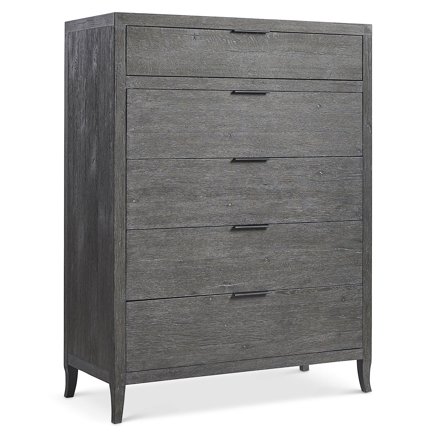The Tribeca tall drawer chest redefines rustic modern style with simple lines and a stunning Tadon finish. The details of the wood are highlighted for a natural beauty. Each of the 5 drawers has a textured metal pull tab in Barlow finish.