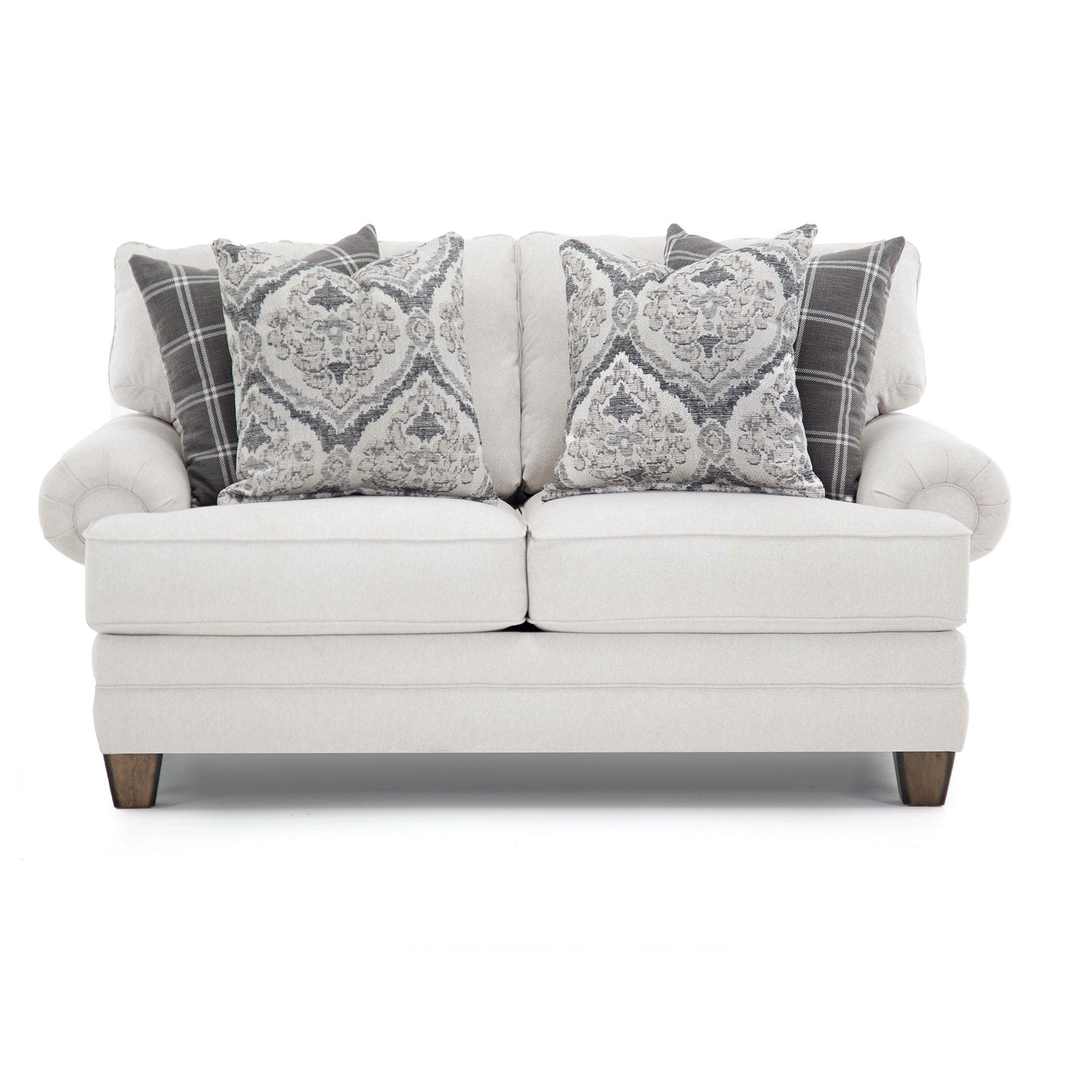 The Walden stationary collection is a transitional collection upholstered in Casey Shell, a light beige polyester fabric. This collection features rolled arms and accent pillows in shades of gray.