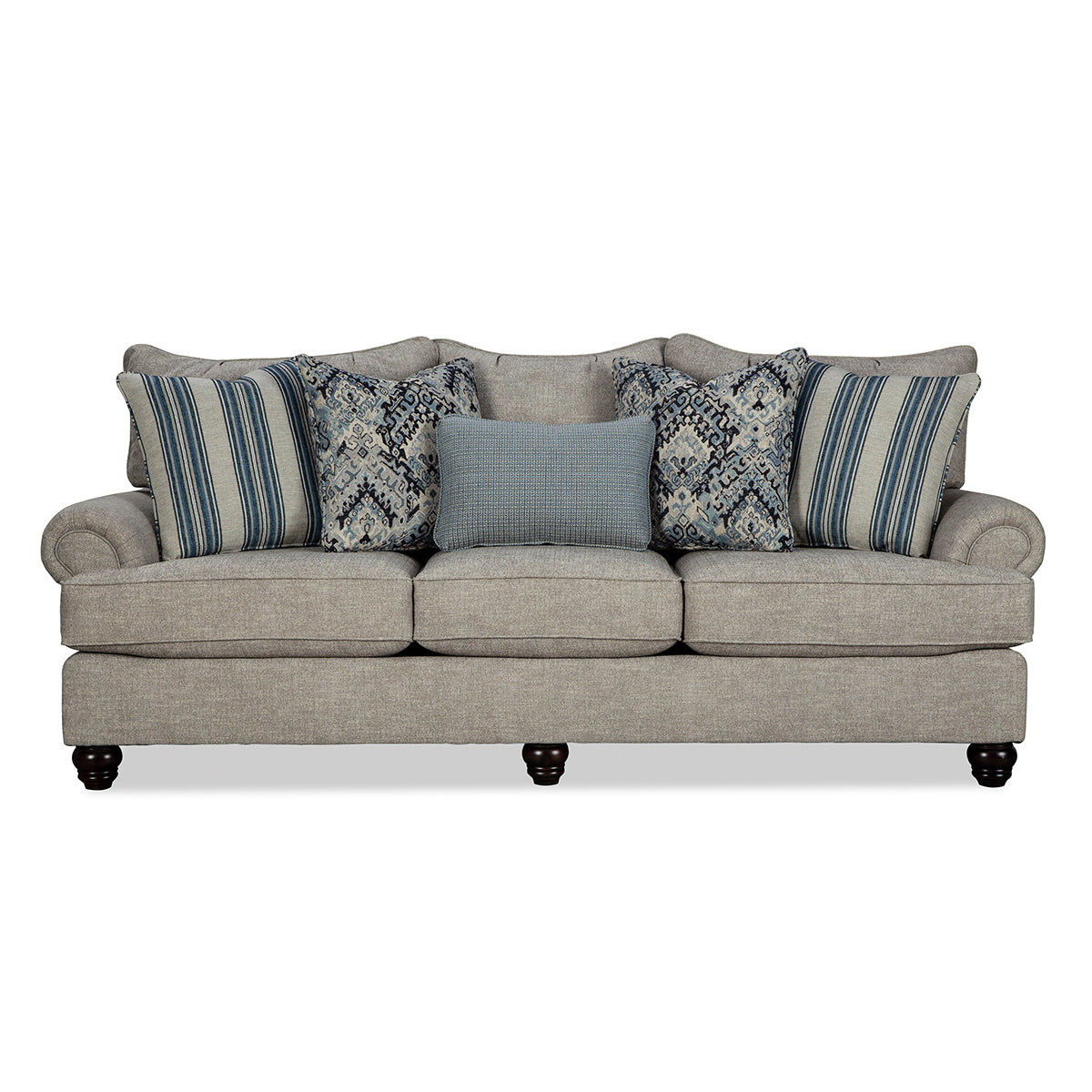 This sofa has lots of style and at 100'' in length, it has room for the whole family! It features 3-seats, 3 loose pillow backs, and 5 accent pillows, along with turned legs and a set-back paneled roll arm. But the comfort is what will win you over - deep and plush, this sofa uses premium cushion and backs to give you a perfect place for relaxing at home.